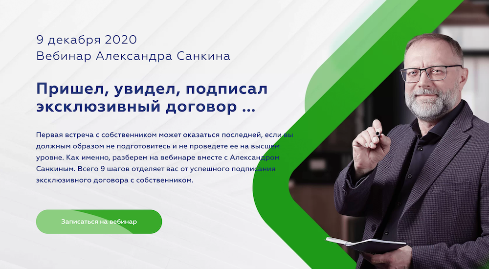 | 9 шагов к подписанию эксклюзивного договора. Алгоритм встречи с собственником. | | | Выбирайте удобный формат и участвуйте!- Бесплатный вебинар 9 декабря 2020 года с 11:00 до 12:00 Мск Онлайн-трансляция на Youtube, продолжительность 1 час.