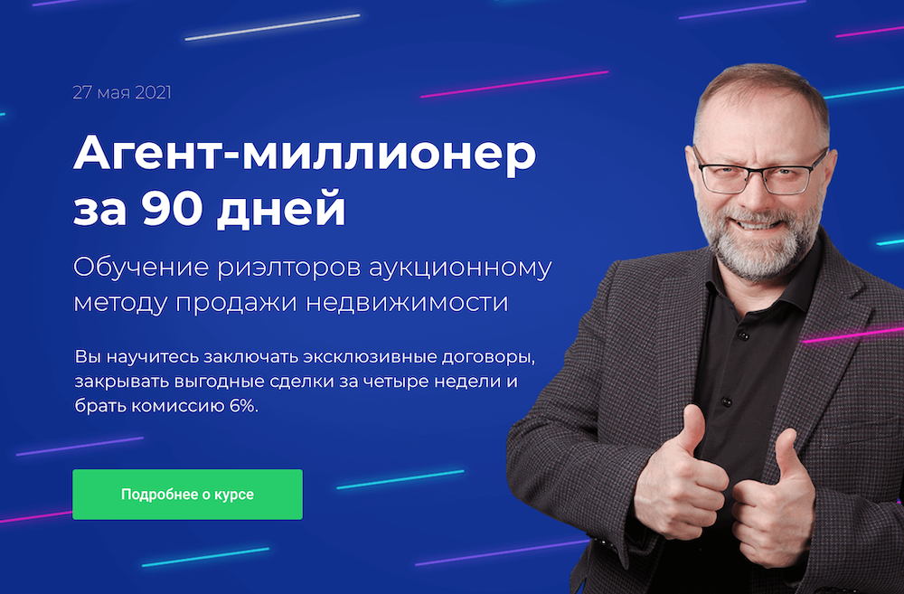 Скидка для подписчиков 10% Старт занятий 39 потока курса "Агент-миллионер за 90 дней" Александра Санкина 27 мая 2021 в 11:30 мск. 5 занятий по четвергам. 2 месяца поддержки и консультаций после окончания курса. Работа в команде опытных агентов-аукционистов. Помощь с первыми аукционами.