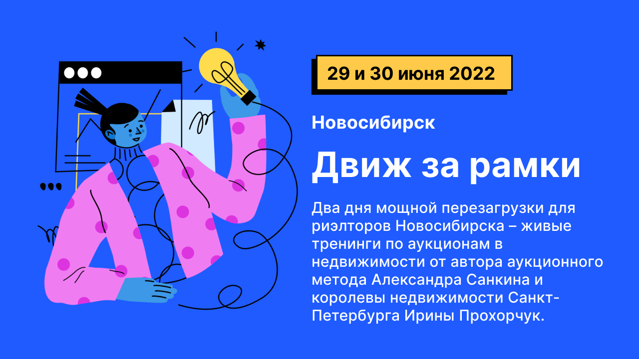 | Движ за рамки в Новосибирске | | | 29 июня с 14.00 до 17.00 (бесплатный мастер-класс) Горский микрорайон, 66, 2 этаж, конференц-зал СберБанк 30 июня с 11.00 до 18.00 ул. Семьи Шамшиных, 65, 2 этаж, офис МакромирДва дня мощной перезагрузки для риэлторов Новосибирска – живые тренинги по аукционам в недвижимости от автора аукционного метода Александра Санкина и королевы недвижимости Санкт-Петербурга Ирины Прохорчук. Программа бесплатного мастер-класса 29 июня:- «Введение в Аукционный Метод. Система Агента-Миллионера»