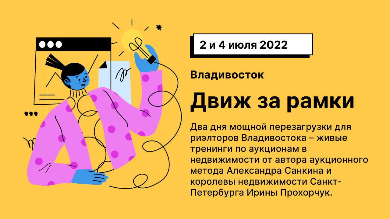 | Живые тренинги для риэлторов, которые хотят увеличить свой чек (г. Владивосток) | | | 2 июля с 11.00 до 14.00 (бесплатный мастер-класс) г. Владивосток, ул. Толстого, 41В - АН "ТИТУЛ ДВ" 4 июля с 11.00 до 17.00 г. Владивосток, Партизанский пр-т, 58 — Конференц-зал «Виктория» Два дня мощной перезагрузки для риэлторов Владивостока – живые тренинги по аукционам в недвижимости от автора аукционного метода Александра Санкина и королевы недвижимости Санкт-Петербурга Ирины Прохорчук. Программа бесплатного мастер-класса 29 июня:- «Введение в Аукционный Метод. Система Агента-Миллионера»